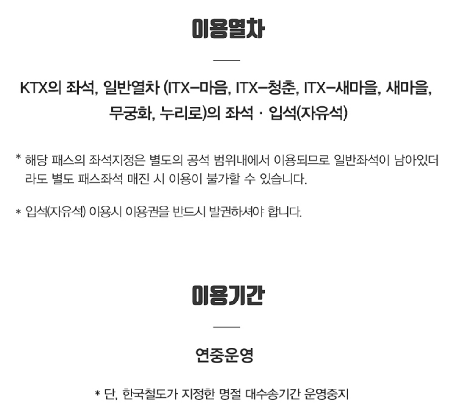 KTX 외 ITX 까지 좌석과 입석을 사용할 수 있으며,
