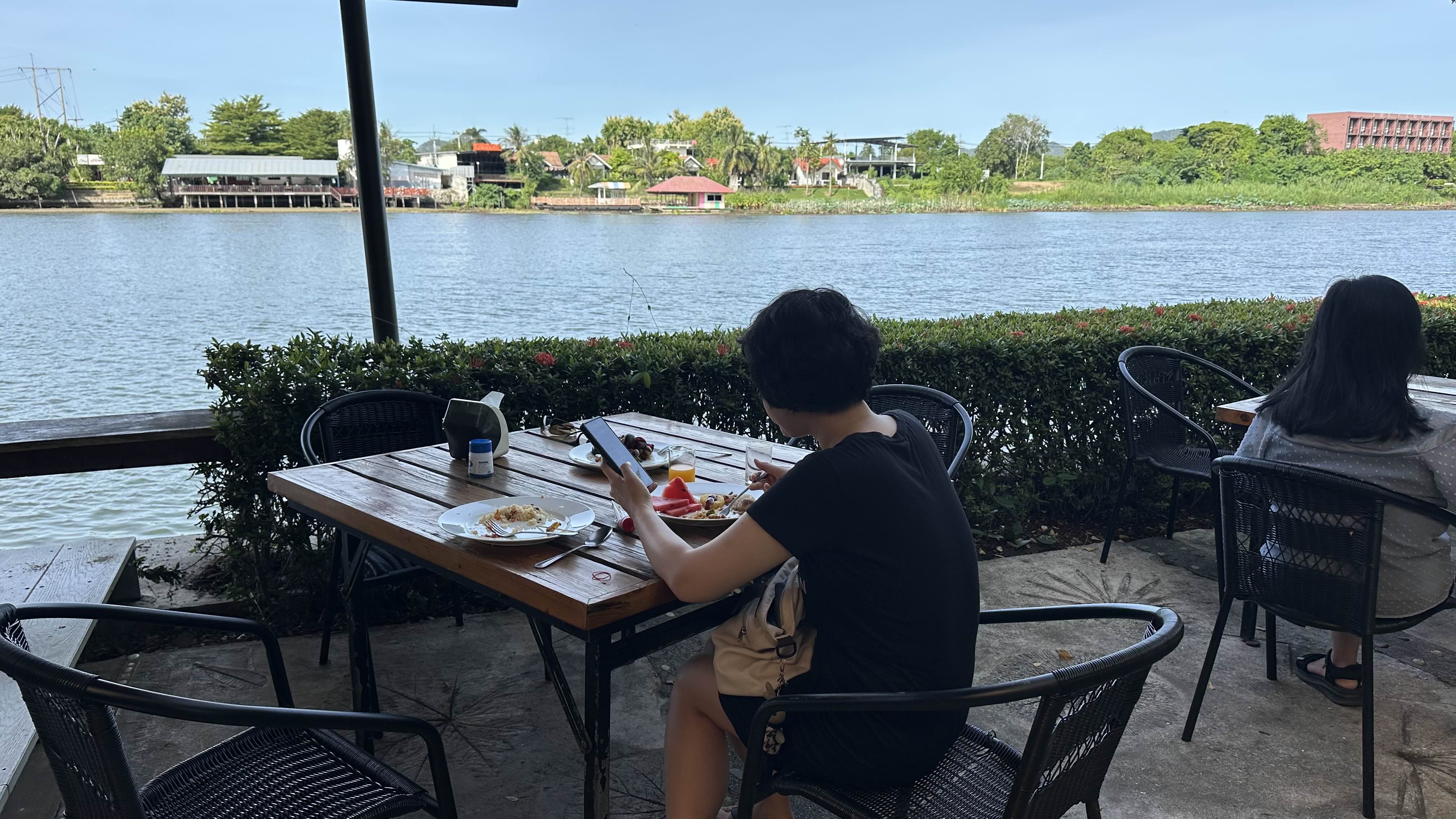 강가에 자리 잡고 식사해요